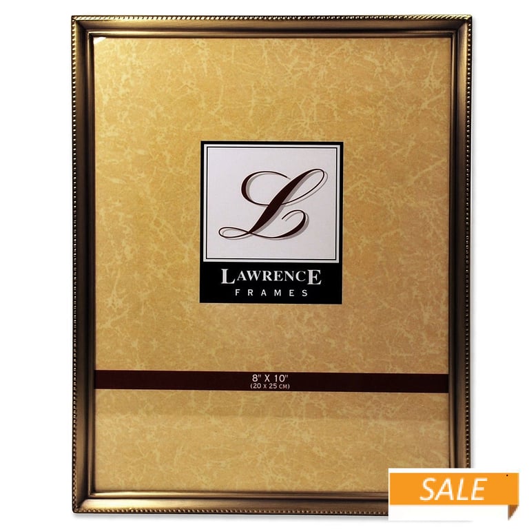 Product Details Lawrence Frames® Satin Antiqued Gold-tone w/caviar Bead Trim 8x10 frame — Antiqued gold-tone frame is nicely crafted with invisible seams and corners.Attractively backed for wonderful desk appeal.Dual easel back for portrait or landscape tabletop display. Glare resistant glass lenses. Frame width is 3/8".By Lawrence®. Click The Lawrence Frame collection to shop the entire line. Satin Antiqued Gold-tone w/caviar Bead Trim 8x10 frame Model #48034906 List $29.50 You pay $15.90 In stock Ships next business day [?] Your Price Match is Active Your request for a price of $0.00 for a minimum quantity of has been accepted. You have [time] left to purchase this item for $0.00 instead of $15.90 each. Find a Lower Price? We BEAT All Authorized Retailers [?] FEATURESDisplays:8"x10"Material:Gold plateFinish:GoldOccasion:Anniversary, Birthday, Good luck, Mother`s Day, Retirement, Romantic, Teacher gifts, Thank-Motivate-Reward, Celebrating Travels, WeddingStyle:Antique, Classic, Traditional, RomanticOrientation:BothBrand:Lawrence Frames®Display Type:Desktop or Wall This item ships in its own box SHARE THIS ITEM Share on Facebook