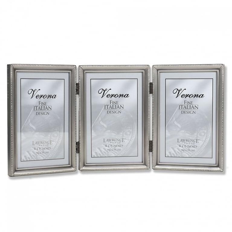 Main view Product Details Lawrence Frames® Satin antiqued pewter-look hinged triple 4x6 w/caviar bead trim — Our beaded antiqued-pewter frame is beautifully crafted with invisible seams and corners.Tightly joined seams and corners are just part of its appeal. Nicely backed for a wonderful table-top accessory. Glare resistant glass lenses. Edge measures 3/8" wide all around.By Lawrence®. Click the Lawrence Frame collection to shop the entire line. Satin antiqued pewter-look hinged triple 4x6 w/caviar bead trim Model #751148061957 List $52.00 You pay $36.95 In stock Can be shipped today [?] Your Price Match is Active Your request for a price of $0.00 for a minimum quantity of has been accepted. You have [time] left to purchase this item for $0.00 instead of $36.95 each. Find a Lower Price? We BEAT All Authorized Retailers [?] FEATURESDisplays:4"x6"Material:SilverplateFinish:SilverOccasion:Anniversary, Baby shower, Business & office, Good luck, Graduation, Home decorating, Housewarming, Mother`s Day, Retirement, Thank-Motivate-Reward, Celebrating Travels, BirthdayStyle:Antique, Classic, TraditionalOrientation:Vertical OnlyBrand:Lawrence Frames®Display Type:Desktop or Wall This item ships in its own box SHARE THIS ITEM Share on Facebook