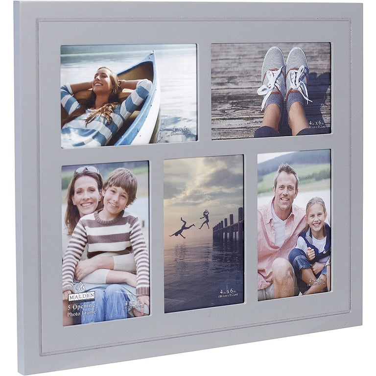 Main view Product Details Malden Designs® DISTRESSED GRAY 5-opening 4x6 collage frame — RUSTIC DESIGN: Five (5) opening 4x6 inch gray collage frame; featuring MDF wood moulding; square edged corners; rustic textured moulding; routed line around perimeter; vertical or horizontal wall hanging or tabletop display PREMIUM QUALITY MATERIALS: Quality MDF Wood; durable glass; swing tab closures on removable back to easily change photos; easel back for horizontal or vertical display; attached hardware on back for wall display ALLURING LOOK: This turquoise decorative collage frame holds five 4x6 inch photos in 3.5x5.5 inch display openings; vertical or horizontal photos; Approximate dimensions: 14.5 (W) x 12.5 (H) x 0.5 (D) inches PERFECT FOR EVERY APPLICATION: This coastal collage frame makes an appealing gift for housewarmings, birthdays, holidays and more; Display on a tabletop or use the hardware on the back to add new life to your walls; Perfect gift for friends and family SECURE PACKAGING: Shipped in secure padded packaging that helps ensure safe delivery By Malden Design® DISTRESSED GRAY 5-opening 4x6 collage frame Model #096287179249 List $33.00 You pay $22.95 In stock Ships next business day [?] Your Price Match is Active Your request for a price of $0.00 for a minimum quantity of has been accepted. You have [time] left to purchase this item for $0.00 instead of $22.95 each. Find a Lower Price? We BEAT All Authorized Retailers [?] FEATURESDisplays:4"x6"Material:Wood (mdf/engineered)Finish:Gray/CharcoalOccasion:Home decoratingStyle:Colonial, Contemporary, Rustic/LodgeOrientation:BothBrand:Malden Designs®Display Type:Wall Only Approx. Overall Dimensions:14 1/2"x12 1/2"x1/2" This item ships in its own box SHARE THIS ITEM Share on Facebook