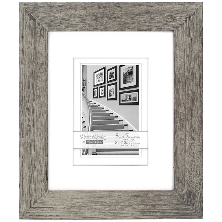 Main view Product Details Malden Designs® Gray MANHATTAN matted 8x10/5x7 frame by Malden Design® — Malden's gray stained wood MANHATTAN style is a flat-top, square cornered silhouette. Displays an 8"x10" print without mat; a 5"x7" print with its soft white mat.Soft white, professional cut mat. Use the include mounts for easy wall hanging.Acid free backing for life-time care of your photo.Crafted by Malden Design®. Gray MANHATTAN matted 8x10/5x7 frame by Malden Design® Model #096287989077 List $23.00 You pay $13.95 This item IS in stock and can be expected to ship 01/28/2026 In stock Your Price Match is Active Your request for a price of $0.00 for a minimum quantity of has been accepted. You have [time] left to purchase this item for $0.00 instead of $13.95 each. Find a Lower Price? We BEAT All Authorized Retailers [?] FEATURESDisplays:5"x7"Material:Wood (full grain)Finish:Gray/CharcoalOccasion:Business & office, Home decorating, Team & coach gifts, Thank-Motivate-Reward, Celebrating TravelsStyle:Architectural, Contemporary, Distressed - Weathered, Rustic/Lodge, SophisticatedOrientation:BothBrand:Malden Designs®Display Type:Desktop or Wall Approx. Overall Dimensions:14 3/4"x17 3/8"x1" This item ships in its own box SHARE THIS ITEM Share on Facebook