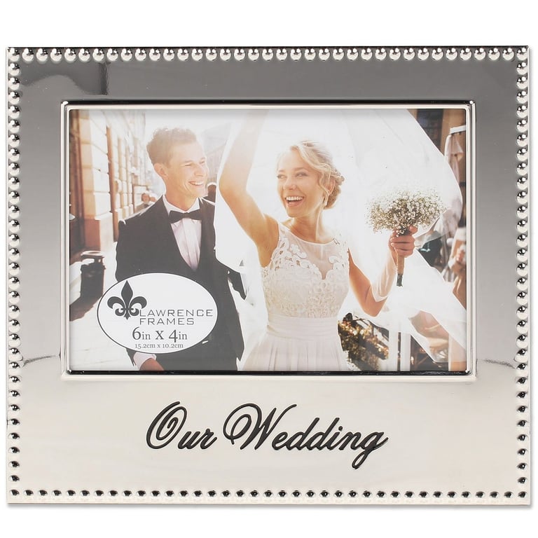 Main view Angled Reverse Product Details Lawrence Frames® OUR WEDDING special engraved celebration frame — A brilliant gift for a loving couple - the special silverplate OUR WEDDING picture frame. Glare resistant glass lens. Easel back for tabletop display. Produced by Lawrence®. OUR WEDDING special engraved celebration frame Model #751148071000 List $24.50 You pay $17.95 This item IS in stock and can be expected to ship 01/15/2026 Your Price Match is Active Your request for a price of $0.00 for a minimum quantity of has been accepted. You have [time] left to purchase this item for $0.00 instead of $17.95 each. Find a Lower Price? We BEAT All Authorized Retailers [?] FEATURESDisplays:4"x6"Material:SilverplateFinish:SilverOccasion:Romantic, WeddingStyle:Classic, Contemporary, Traditional, Words & whimsy, Sentiments | ready made, RomanticOrientation:Horizontal OnlyBrand:Lawrence Frames®Display Type:Tabletop (or wall w/optional hanger - available separately) Approx. Overall Dimensions:7 1/2"x5 7/8"x7/8" This item ships in its own box SHARE THIS ITEM Share on Facebook