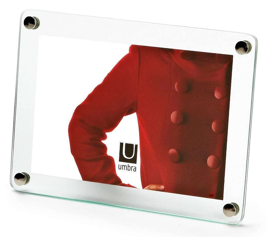 Main view Series Product Details Umbra® Design CLARA glass 4x6 frame by Umbra — The CLARA glass frame with nickel metallic corner fasteners. Important - item is clear glass - image has a blue reflection to aid viewing on-line. Dual easel back for portrait or landscape tabletop display. Wall hooks also included for easy hanging. Glare resistant glass lens. The unique design permits the easel to be detached from the back for flush wall mounting.Designed by David Fleishman and Jason Nip. From the Umbra® collection. click: Umbra® designs. CLARA glass 4x6 frame by Umbra Model #028295115209 List $29.50 You pay $24.95 In stock Ships next business day [?] Your Price Match is Active Your request for a price of $0.00 for a minimum quantity of has been accepted. You have [time] left to purchase this item for $0.00 instead of $24.95 each. Find a Lower Price? We BEAT All Authorized Retailers [?] Approx. Overall Dimensions:9 3/8"x11 11/16"x1 5/16" This item ships in its own box SHARE THIS ITEM Share on Facebook
