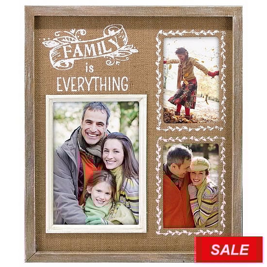 Back to results Scroll Items 10067 of 11042 Main view Product Details Malden Designs® FAMILY IS EVERYTHING BURLAP collage frame by Malden — Malden's FAMILY IS EVERYTHING BURLAP mat frame is the perfect place to showcase your favorite family moments. Displays three prints, one 5"x7" print and two 3.5"x5" prints. Easel back for vertical tabletop display. Glare resistant glass lens. Quality crafted by Malden®. FAMILY IS EVERYTHING BURLAP collage frame by Malden Model #096287141376 List $22.50 You pay $11.90 In stock Ships next business day [?] Your Price Match is Active Your request for a price of $0.00 for a minimum quantity of has been accepted. You have [time] left to purchase this item for $0.00 instead of $11.90 each. Find a Lower Price? We BEAT All Authorized Retailers [?] FEATURESDisplays:5"x7"Material:Wood (mdf/engineered)Finish:BrownOccasion:Celebrating Travels, Friendship, Thank-Motivate-RewardStyle:Coastal, Contemporary, Distressed - Weathered, Rustic/Lodge, Words & whimsy, Sentiments | ready madeOrientation:Vertical OnlyBrand:Malden Designs®Display Type:Desktop or Wall Approx. Overall Dimensions:12"x14"x1" This item ships in its own box SHARE THIS ITEM Share on Facebook
