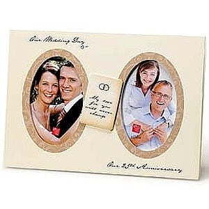Main view Product Details Russ Berrie US Gift, Inc. Special 25th Anniversary oval duo by Russ Berrie — Our 25th Anniversary frame is a special double to celebrate "then" and "now".Contemporary earth-tone matted wood frame with a romantic love letter attached, has two 4"x6" openings to hold a wedding and anniversary photo.Etching on the frame inscribes "Our Wedding Day" (left) and "Our 25th Anniversary". (right)Glare resistant glass lens. Easel back for tabletop display.Another very special occasion frame from Russ Berrie®. Special 25th Anniversary oval duo by Russ Berrie Model #039915367779 List $25.00 You pay $17.95 In stock Ships next business day [?] Your Price Match is Active Your request for a price of $0.00 for a minimum quantity of has been accepted. You have [time] left to purchase this item for $0.00 instead of $17.95 each. Find a Lower Price? We BEAT All Authorized Retailers [?] FEATURESDisplays:4"x6"Material:Wood (full grain)Finish:SilverOccasion:Anniversary, RomanticStyle:Romantic, Words & whimsy, Sentiments | ready madeOrientation:Vertical OnlyBrand:Russ Berrie US Gift, Inc. This item ships in its own box SHARE THIS ITEM Share on Facebook