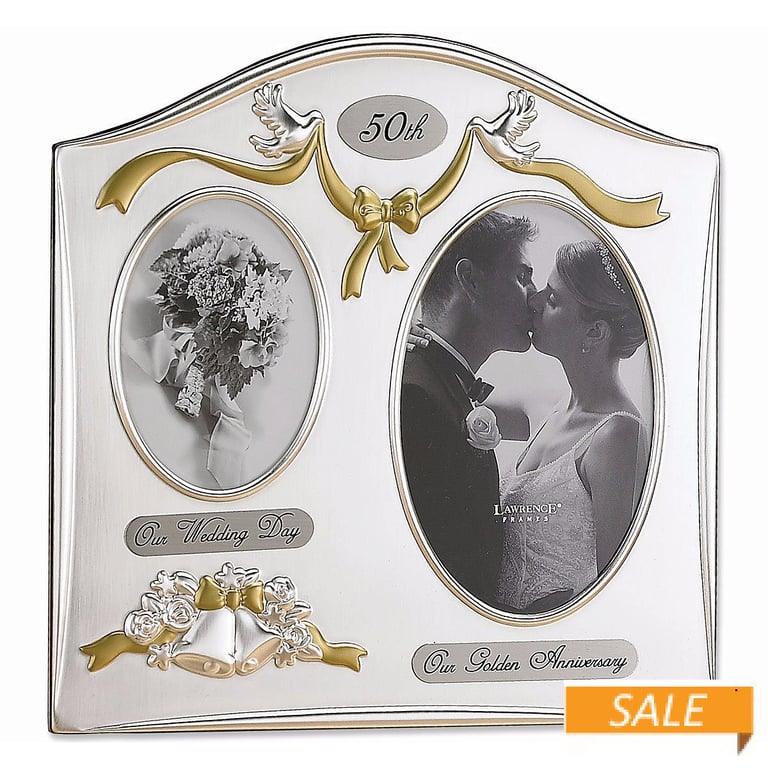 Product Details Lawrence Frames® OUR GOLDEN 50th ANNIVERSARY duet frame — Satin silver plated and lacquer coated picture frame with 50th anniversary theme - great for "then and now" stories~ Traditional silver metal frame that will compliment any décor Constructed of heavy weight metal and silver-plated. Includes high quality black velvet backing Silver plated perfect for engraving Wipe clean with dry cloth, glass included Holds 4"x6" photo By Lawrence®, fine frames for generations. OUR GOLDEN 50th ANNIVERSARY duet frame Model #751148059985 List $47.00 You pay $21.90 In stock Ships next business day [?] Your Price Match is Active Your request for a price of $0.00 for a minimum quantity of has been accepted. You have [time] left to purchase this item for $0.00 instead of $21.90 each. Find a Lower Price? We BEAT All Authorized Retailers [?] FEATURESDisplays:4"x6"Material:Metallic (all)Finish:Gold, SilverOccasion:AnniversaryStyle:Contemporary, Romantic, Traditional, Words & whimsy, Sentiments | ready madeOrientation:Vertical OnlyBrand:Lawrence Frames® Approx. Overall Dimensions:9"x9 1/4"x3/4" This item ships in its own box SHARE THIS ITEM Share on Facebook