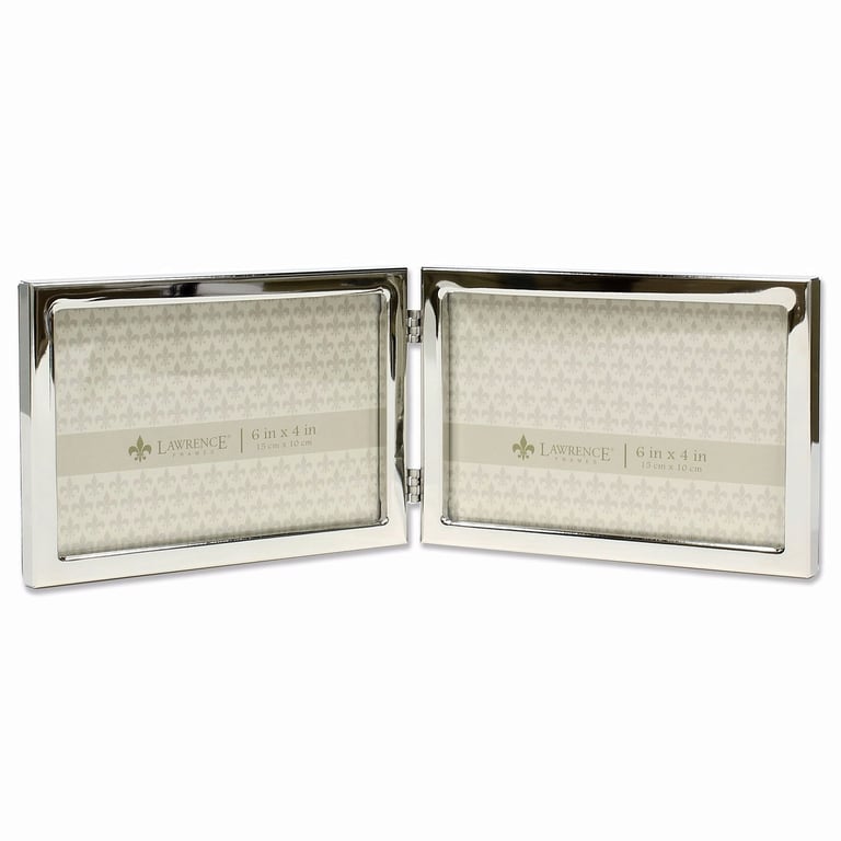 Main view Product Details Lawrence Frames® Polished silver landscape 6x4 double hinged frame — Polished silverplate frame is a beautifully crafted desk piece with invisible seams and corners. Attractively backed with high quality navy velvet for wonderful desk appeal. Glare resistant glass lenses. Brass hinges for smooth closing.By Lawrence®. Click the Lawrence Frame collection to shop the entire line. Polished silver landscape 6x4 double hinged frame Model #751148070126 List $40.00 You pay $29.95 This item is currently out of stock and we do not have an expected date at the present time. click here to be automatically notified when it comes back in stock or email merchandising@sendaframe.com for availability information. You can place this item in your shopping cart. It will be added to the 'saved for later' section. Your Price Match is Active Your request for a price of $0.00 for a minimum quantity of has been accepted. You have [time] left to purchase this item for $0.00 instead of $29.95 each. Find a Lower Price? We BEAT All Authorized Retailers [?] FEATURESDisplays:4"x6"Material:SilverplateFinish:SilverOccasion:Anniversary, Birthday, Good luck, Mother`s Day, Retirement, Romantic, Teacher gifts, Thank-Motivate-Reward, Celebrating Travels, WeddingStyle:Antique, Classic, Traditional, RomanticOrientation:Horizontal OnlyBrand:Lawrence Frames®Display Type:Desktop or Wall Approx. Overall Dimensions:12 3/8"x4 5/8"x1 3/16" This item ships in its own box SHARE THIS ITEM Share on Facebook