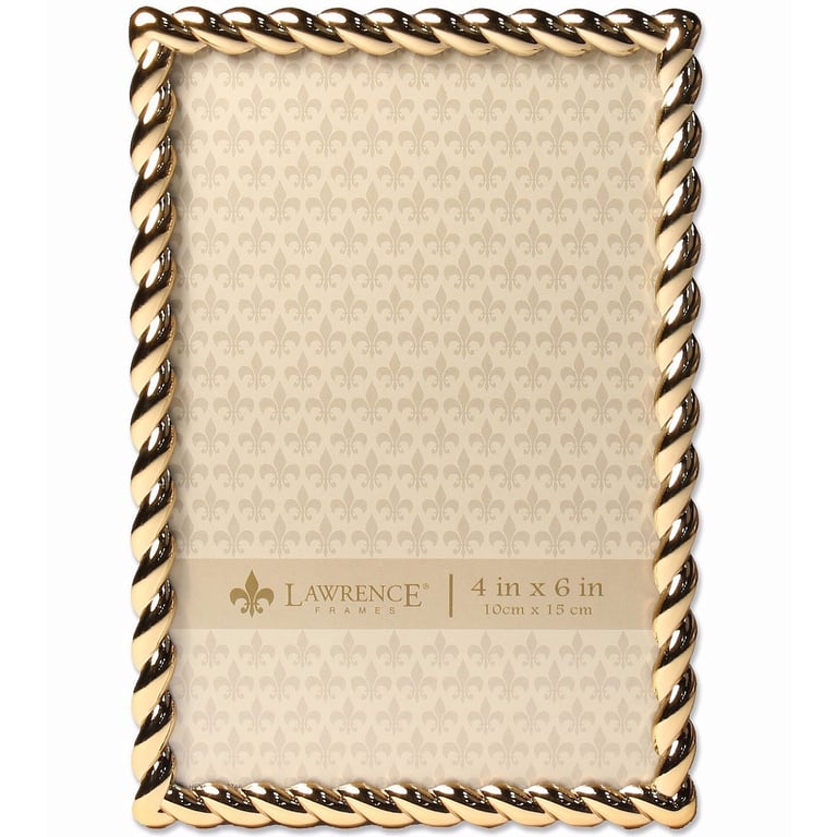 Main view Angled Reverse Product Details Lawrence Frames® GOLDEN ROPE 4x6 frame — ROPE border accent gives this style a glam look. Gold plated finish never needs care - just a wipe with damp cloth.Hardboard backed with dual easel for portrait or landscape display. Glare resistant glass lens.By Lawrence Frames, fine frames for generations. GOLDEN ROPE 4x6 frame Model #751148070133 List $26.50 You pay $20.95 This item IS in stock and can be expected to ship 01/20/2026 Your Price Match is Active Your request for a price of $0.00 for a minimum quantity of has been accepted. You have [time] left to purchase this item for $0.00 instead of $20.95 each. Find a Lower Price? We BEAT All Authorized Retailers [?] FEATURESDisplays:4"x6"Material:Metallic (all)Finish:GoldOccasion:Business & office, Employee honors, Good luck, Home decorating, Housewarming, Thank-Motivate-Reward, Celebrating Travels, BirthdayStyle:Classic, Contemporary, OrnateOrientation:BothBrand:Lawrence Frames®Display Type:Desktop or Wall Approx. Overall Dimensions:5 1/4"x7 1/4" This item ships in its own box SHARE THIS ITEM Share on Facebook