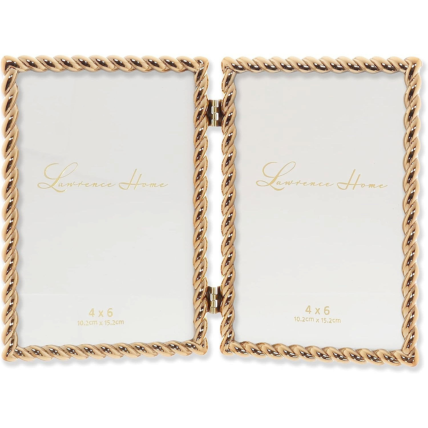 Main view Product Details Lawrence Frames® GOLDEN ROPE 4x6 Double frame — ROPE border accent gives this style a glam look. Gold plated finish never needs care - just a wipe with damp cloth.Hardboard backed with dual easel for portrait or landscape display. Glare resistant glass lens.By Lawrence®, fine frames for generations. GOLDEN ROPE 4x6 Double frame Model #751148085540 List $41.00 You pay $33.95 This item is currently out of stock and we do not have an expected date at the present time. click here to be automatically notified when it comes back in stock or email merchandising@sendaframe.com for availability information. You can place this item in your shopping cart. It will be added to the 'saved for later' section. Your Price Match is Active Your request for a price of $0.00 for a minimum quantity of has been accepted. You have [time] left to purchase this item for $0.00 instead of $33.95 each. Find a Lower Price? We BEAT All Authorized Retailers [?] FEATURESDisplays:4"x6"Material:Metallic (all)Finish:GoldOccasion:Business & office, Employee honors, Good luck, Home decorating, Housewarming, Thank-Motivate-Reward, Celebrating Travels, BirthdayStyle:Classic, Contemporary, OrnateOrientation:BothBrand:Lawrence Frames®Display Type:Desktop or Wall This item ships in its own box SHARE THIS ITEM Share on Facebook