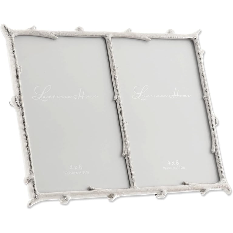 Main view Product Details Lawrence Frames® Silver Metal Natural Branch Motif 4x6 Double Frame by Lawrence® — Decorative silver branches are the unique design of this picture frame. Polished silverplated metal frame has a rich and lustrous finish. High quality black velvet backing with easel for vertical or horizontal tabletop display, and comes with hangers for vertical or horizontal wall mounting. Heavy weight cast metal picture frame. Glass lens. Individually boxed.Dual easel back for portrait or landscape tabletop display. Wall mounts for easy hanging. By Lawrence Frames® Silver Metal Natural Branch Motif 4x6 Double Frame by Lawrence® Model #751148093538 List $39.00 You pay $29.95 This item IS in stock and can be expected to ship 02/02/2026 Your Price Match is Active Your request for a price of $0.00 for a minimum quantity of has been accepted. You have [time] left to purchase this item for $0.00 instead of $29.95 each. Find a Lower Price? We BEAT All Authorized Retailers [?] FEATURESDisplays:4"x6"Material:SilverplateFinish:SilverOccasion:Anniversary, Birthday, Business & office, Corporate gifts, Engagement, Friendship, Good luck, Home decorating, Weekend Host Gifts, Housewarming, Mother`s Day, Retirement, Thank-Motivate-Reward, WeddingStyle:Classic, TraditionalOrientation:Vertical OnlyBrand:Lawrence Frames®Display Type:Desktop or Wall This item ships in its own box SHARE THIS ITEM Share on Facebook