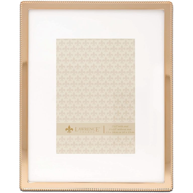 Main view Product Details Lawrence Frames® Beaded Trim Gold finish 8x10/5x7 frame by Lawrence® — Gold metal picture frame with classic bead design. This heavy weight cast metal frame has a rich and lustrous gold finish. Frame displays a 5"x7" with its soft-white mat; an 8x10" without mat. High quality black velvet backing with easel for vertical or horizontal tabletop display, and comes with hangers for vertical or horizontal wall mounting. Glare resistant glass lens. By Lawrence Frames®, crafting fine frames for generations. Beaded Trim Gold finish 8x10/5x7 frame by Lawrence® Model #751148079150 List $45.00 You pay $34.95 This item IS in stock and can be expected to ship 01/30/2026 In stock Your Price Match is Active Your request for a price of $0.00 for a minimum quantity of has been accepted. You have [time] left to purchase this item for $0.00 instead of $34.95 each. Find a Lower Price? We BEAT All Authorized Retailers [?] FEATURESDisplays:5"x7"Material:Gold plateFinish:GoldOccasion:Anniversary, Birthday, Business & office, Congratulations, Friendship, Home decorating, Retirement, Thank-Motivate-RewardStyle:Contemporary, SophisticatedOrientation:BothBrand:Lawrence Frames®Display Type:Desktop or Wall Approx. Overall Dimensions:8 3/4"x10 3/4"x3/4" This item ships in its own box SHARE THIS ITEM Share on Facebook