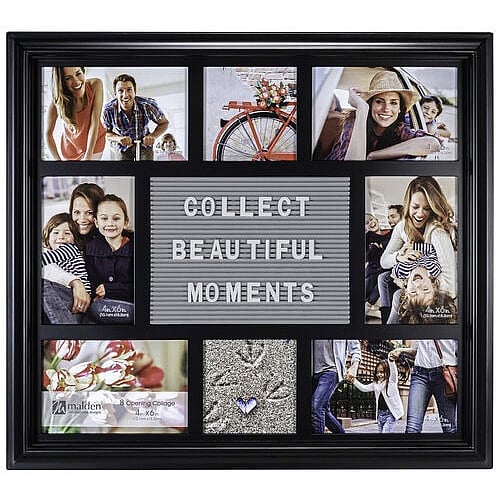 Main view Product Details Malden Designs® 8-OPENING LETTERBOARD Black frame by Malden® — Malden's large felt Letterboard + 8-opening frame is great for Sharing Event photos - especially Back to School Milestones or Baby Announcements. Includes one black letterboard collage frame with grey felt background and letters and numbers for personalization Displays 6 - 4"x6" photos and 2 - 4"x4" photos. Trendy and fun, this letterboard set makes a great prop for Instagram photos A great way to welcome your baby into the world and celebrate special moments By Malden Design. 8-OPENING LETTERBOARD Black frame by Malden® Model #096287173421 List $28.00 You pay $25.95 In stock Can be shipped today [?] Your Price Match is Active Your request for a price of $0.00 for a minimum quantity of has been accepted. You have [time] left to purchase this item for $0.00 instead of $25.95 each. Find a Lower Price? We BEAT All Authorized Retailers [?] FEATURESMaterial:Wood (mdf/engineered)Finish:BlackOccasion:Back to School, Birthday (child), Group Events + Parties, Sweet 16, WeddingStyle:Contemporary, Words & whimsyBrand:Malden Designs®Display Type:Desktop or Wall Approx. Overall Dimensions:18 1/4"x16 1/4"x1 1/2" This item ships in its own box SHARE THIS ITEM Share on Facebook