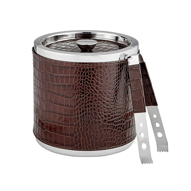 Main view Product Details Graphic Image® ICE BUCKET + TONGS Brown Croco-Leather by Graphic Image® — A classy and stylish lidded leather ice bucket in embossed crocodile with removable polished metal insert. Includes ice tongs with matching leather grip. Italian Embossed Crocodile leather Handcrafted stainless- steel ice bucket with ice tongs Leather wrapped Made in New York, USA Holds 3 quarts Size 7.5” round Graphic Image™ hand-crafts genuine leather books and gifts that have set the modern day standard for quality and design. ICE BUCKET + TONGS Brown Croco-Leather by Graphic Image® Model #611959720583 $172.00 This item IS in stock and can be expected to ship 01/16/2026 Your Price Match is Active Your request for a price of $0.00 for a minimum quantity of has been accepted. You have [time] left to purchase this item for $0.00 instead of $172.00 each. Find a Lower Price? We BEAT All Authorized Retailers [?] FEATURESMaterial:Leather (fine)Finish:Brown, SilverOccasion:Birthday, Congratulations, Group Events + Parties, Friendship, Good luck, Home decorating, Housewarming, Inspirational, Retirement, Thank-Motivate-Reward, Wedding, Weekend Host GiftsStyle:Contemporary, Sports & leisure, ModernBrand:Graphic Image®Display Type:not applicable n/a This item ships in its own box SHARE THIS ITEM Share on Facebook