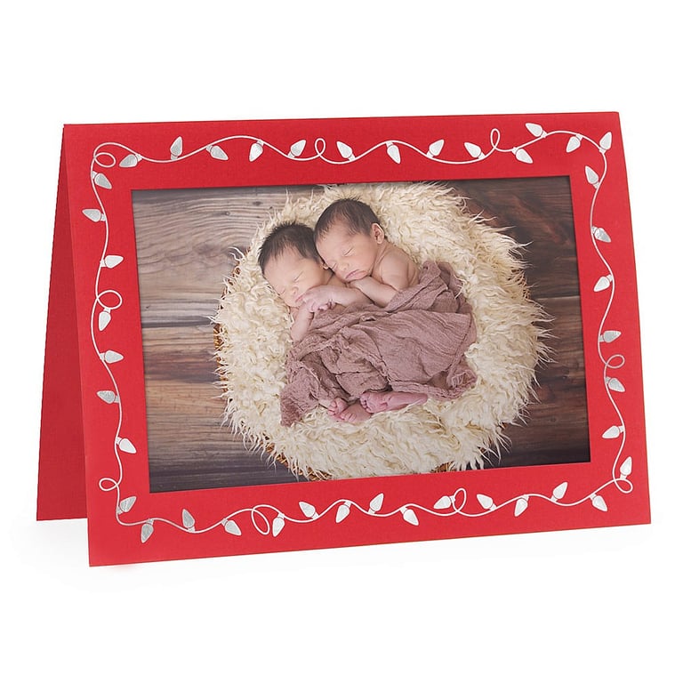 Main view Product Details Collectors Gallery CHRISTMAS LIGHTS premium 4x6 photo insert Holiday Card (sold in 10s) — Inside Greeting: blank Holds a 4" x 6" photo on the front cover of the card This red Christmas photo frame card has a gold foil design on the front window frame. A simple, cheerful strand of metallic silver lights adorn the window frame border. Just slide your picture behind the window opening to create an instant personalized photo card. Cards are full-color throughout. The front color carries through to the inside and back of the card. Our red photo window frame card is made from a solid, vibrant red paper stock. Metallic gold or silver looks best for writing inside. Features & Information 5" x 7" folded card with 3 ½" x 5 ½" window opening Holds a 4" x 6" photo, picture or print Photo slides into the front of the card Blank inside (optional foil imprinting) For horizontal or vertical photographs Includes white mailing envelope (additional available - see ACCESSORIES) Acid-free & archival paper stock Made in the USA Personalizing available - ADD to CART to see link and options. Folders are individually priced; sold in 10's. Made in America. CHRISTMAS LIGHTS premium 4x6 photo insert Holiday Card (sold in 10s) Model #021352011100 List $25.00 You pay $18.90 ( set of 10 / $1.89 ea ) This item can be expected to ship by 12/09/2025. Order now by clicking ADD TO CART (below); you are only charged when we actually ship. Or, Click here to be automatically notified when it comes back in stock. Your Price Match is Active Your request for a price of $0.00 for a minimum quantity of has been accepted. You have [time] left to purchase this item for $0.00 instead of $1.89 each. Find a Lower Price? We BEAT All Authorized Retailers [?] Approx. Overall Dimensions:5"x7" SHARE THIS ITEM Share on Facebook