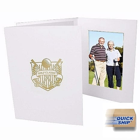 Our photo folder in white, accented with a golf inspired crest in gold foil. The design is hot stamped (imprinted) onto the front of the folder.