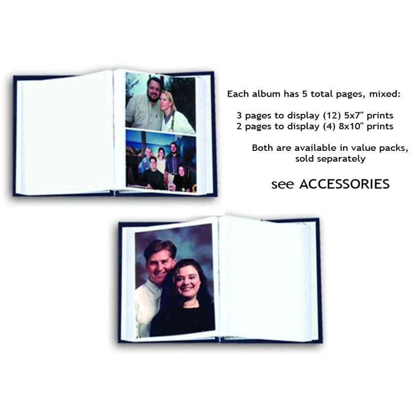 Album comes with 2 kinds of pages to hold (12) 5x7" and (4) 8x10" photos (back and front)