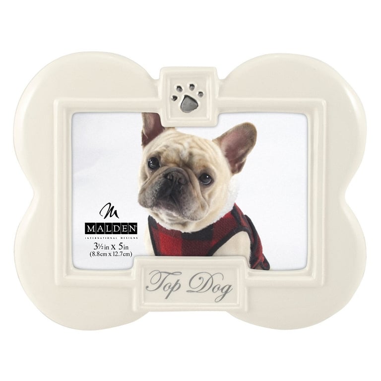 Product Details Malden Designs® TOP DOG ceramic frame is perfect for a dog lover by Malden Designs® — Beautifully constructed to display a 3"x5" photo, this is an easy picture frame to give to the dog lovers in your life.Crafted of ceramic; glare resistant glass lens.Crafted by Malden Designs® New England. TOP DOG ceramic frame is perfect for a dog lover by Malden Designs® Model #096287127691 List $12.50 You pay $9.95 In stock Ships next business day [?] Your Price Match is Active Your request for a price of $0.00 for a minimum quantity of has been accepted. You have [time] left to purchase this item for $0.00 instead of $9.95 each. Find a Lower Price? We BEAT All Authorized Retailers [?] FEATURESDisplays:3.50"x5"Material:CeramicFinish:WhiteOccasion:Friendship, Pet LoveStyle:Animals & pets, Contemporary, Words & whimsy, Sentiments | ready madeOrientation:Horizontal OnlyBrand:Malden Designs®Display Type:Desktop Only Approx. Overall Dimensions:7 1/2"x6" This item ships in its own box SHARE THIS ITEM Share on Facebook