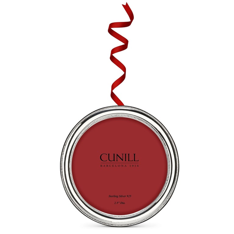 Main view Dual back Product Details Cunill® Silver Fine Sterling BEADED ROUND 2-in-1 Ornament/Frame by Cunill® Italy — This wonderful piece from Cunill® Silversmiths holds a 2½" x 2½" mini photo. (your photo probably needs to be cut to round shape). Features a fine inner and outer caviar beading accent. Ships with 2 backs: one with an easel for table-top display and 1 unique back, with red satin ribbon - for hanging.Pure .925 fine silver, the piece is tarnish resistant for care-free display. A wonderfully worked, heavy sterling piece by master silversmiths, the quality is unsurpassed. Frame comes with 2 backs - 1 for tabletop display and 1 for hangng. Crafted in - and imported from - Cunill Italy. SendAFrame carries the complete Cunill® frame collection Fine Sterling BEADED ROUND 2-in-1 Ornament/Frame by Cunill® Italy Model #706098612629 List $100.00 You pay $91.95 In stock Can be shipped today [?] Your Price Match is Active Your request for a price of $0.00 for a minimum quantity of has been accepted. You have [time] left to purchase this item for $0.00 instead of $91.95 each. Find a Lower Price? We BEAT All Authorized Retailers [?] FEATURESDisplays:2.50"x2.50"Material:Sterling Silver (fine)Finish:SilverOccasion:Anniversary, Baby shower, Baptism + Christening, Birthday, Communion, Congratulations, Employee honors, Good luck, Housewarming, Mother`s Day, New baby, Romantic, Sweet 16, ChristmasStyle:Classic, Contemporary, Traditional, Distinctive, Romantic, Unique | LimitedBrand:Cunill® SilverDisplay Type:Desktop or Wall This item ships in its own box SHARE THIS ITEM Share on Facebook