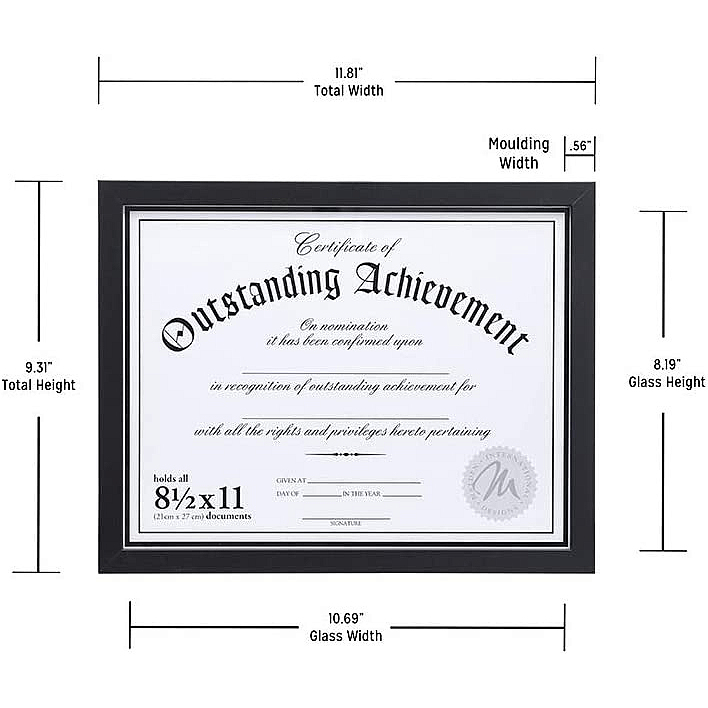 Main view Product Details Malden Designs® Black Wood Certificate 11x8.5 frame by Malden Home Profiles® — This is a contemporary piece crafted in ebony-black wood.Square edged corners and nice grain detail, it has a quality look and feel at a value price.Displays an 11" x 8½" document, diploma or certificate print. Moulding is 5/8" wide.Easel back mount for tabletop display. Wall mounting attachments included. Glare resistant glass lens.Quality crafted by Malden®. To see the collection, click Malden Design® Black Wood Certificate 11x8.5 frame by Malden Home Profiles® Model #096287060196 List $17.50 You pay $13.95 This item IS in stock and can be expected to ship 01/29/2026 In stock Your Price Match is Active Your request for a price of $0.00 for a minimum quantity of has been accepted. You have [time] left to purchase this item for $0.00 instead of $13.95 each. Find a Lower Price? We BEAT All Authorized Retailers [?] FEATURESDisplays:8.50"x11"Material:Wood (mdf/engineered)Finish:BlackOccasion:Business & officeStyle:Classic, Contemporary, TraditionalOrientation:BothBrand:Malden Designs®Display Type:Desktop or Wall Approx. Overall Dimensions:11 15/16"x9 1/2"x3/4" SHARE THIS ITEM Share on Facebook
