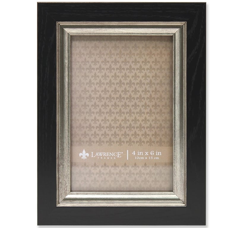 Main view Rear Angled Product Details Lawrence Frames® Black w/Burnished-Silver trim composite-wood two-tone frame by Lawrence Frames® — Black and burnished-silver composite picture frame. Includes a two-way easel for table top and wall hangers - for vertical or horizontal display. High quality black velvet backing. Picture frame comes with glass to protect your photo, and is individually boxed. By Lawrence Frames® Black w/Burnished-Silver trim composite-wood two-tone frame by Lawrence Frames® Model #48068345 List $14.00 You pay $10.95 This item IS in stock and can be expected to ship 11/21/2025 Your Price Match is Active Your request for a price of $0.00 for a minimum quantity of has been accepted. You have [time] left to purchase this item for $0.00 instead of $10.95 each. Find a Lower Price? We BEAT All Authorized Retailers [?] FEATURESDisplays:4"x6"Material:Wood (mdf/engineered)Finish:Black, Bronze, SilverOccasion:Business & office, Corporate gifts, Group Events + Parties, Home decorating, Teacher gifts, Team & coach giftsStyle:Ornate, TraditionalOrientation:BothBrand:Lawrence Frames®Display Type:Desktop or Wall Approx. Overall Dimensions:6 3/16"x8 3/16"x13/16" This item ships in its own box SHARE THIS ITEM Share on Facebook