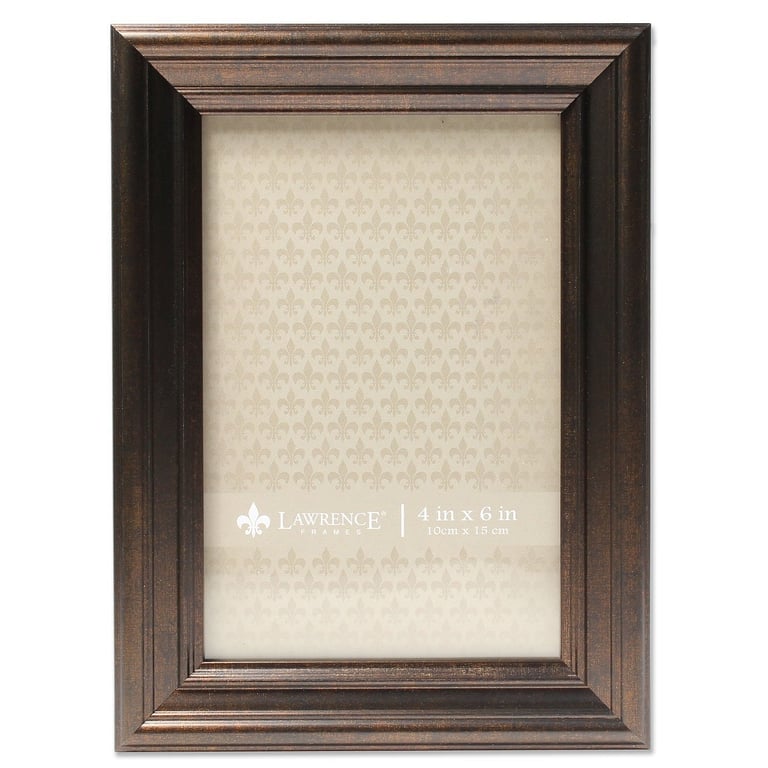 Main view Product Details Lawrence Frames® Burnished Bronze Ridged 4x6 frame by Lawrence Frames® — High quality burnished bronze composite picture frame Decorative picture frame Black velvet backing Vertical or horizontal tabletop display or can be hung on a wall with installed hangers Glare resistant glass lens Wipe clean with dry cloth, glass included Produced by Lawrence Frames®. Burnished Bronze Ridged 4x6 frame by Lawrence Frames® Model #48071116 List $14.00 You pay $10.95 This item IS in stock and can be expected to ship 11/21/2025 Your Price Match is Active Your request for a price of $0.00 for a minimum quantity of has been accepted. You have [time] left to purchase this item for $0.00 instead of $10.95 each. Find a Lower Price? We BEAT All Authorized Retailers [?] FEATURESDisplays:4"x6"Material:Wood (mdf/engineered)Finish:BronzeOccasion:Business & office, Home decoratingStyle:Classic, TraditionalOrientation:BothBrand:Lawrence Frames®Display Type:Desktop or Wall Approx. Overall Dimensions:5 13/16"x7 13/16"x11/16" This item ships in its own box SHARE THIS ITEM Share on Facebook