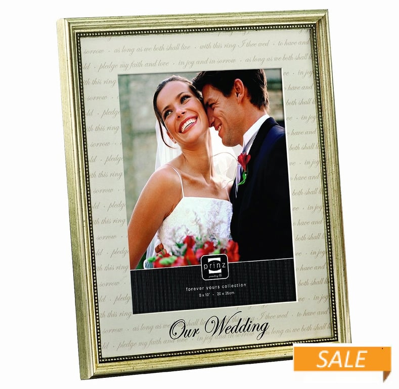 Main view Detail Product Details Prinz® frames & albums OUR WEDDING matted 8x10 frame by Prinz® — Designed with fine detailing, OUR WEDDING has a beautiful ridged moulding with a beaded accent that will add character to your photo. The printed beveled mat subtlety scrolls inspirational words. Crafted of 80% recycled styrene. Features a velvet easel back for vertical table-top display. Or, use the included hooks for easy wall mounting. Glare resistant glass lens.By Prinz®. OUR WEDDING matted 8x10 frame by Prinz® Model #086981748308 List $26.00 You pay $13.90 In stock Can be shipped today [?] Your Price Match is Active Your request for a price of $0.00 for a minimum quantity of has been accepted. You have [time] left to purchase this item for $0.00 instead of $13.90 each. Find a Lower Price? We BEAT All Authorized Retailers [?] FEATURESDisplays:8"x10"Material:Acrylic | ResinFinish:Gold, SilverOccasion:Anniversary, Romantic, WeddingStyle:Classic, Romantic, Traditional, Words & whimsyOrientation:Vertical OnlyBrand:Prinz® frames & albums This item ships in its own box SHARE THIS ITEM Share on Facebook