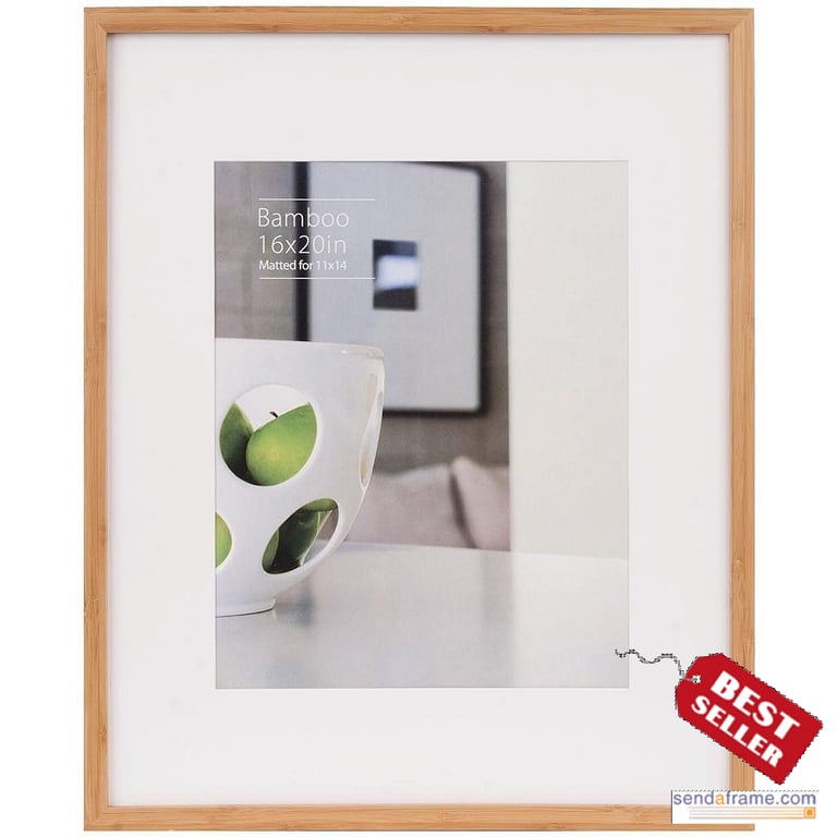 Main view Product Details Gallery Solutions™ CONTEMPORARY Bamboo Natural-stain matted 16x20/11x14 frame by EcoCare® — Produced from renewable resources, the CONTEMPORARY series is 100% natural bamboo in a flat-top profile.Water-based blonde stain with a unique natural grain has a particularly attactive look and feel. The CONTEMPORARY matted wood frame displays an 11"x14" print in a traditional flat-top design. Frame opening without mat is 16"x20". Wall mounts included for easy hanging. Acid-free white-core mat and backing for life-time care of your print. Glare resistant, UV glazed glass lens. Crafted by EcoCare®, a division of Nielsen-Bainbridge®. CONTEMPORARY Bamboo Natural-stain matted 16x20/11x14 frame by EcoCare® Model #087828303292 List $80.00 You pay $68.95 In stock Can be shipped today [?] Your Price Match is Active Your request for a price of $0.00 for a minimum quantity of has been accepted. You have [time] left to purchase this item for $0.00 instead of $68.95 each. Find a Lower Price? We BEAT All Authorized Retailers [?] Approx. Overall Dimensions:17 1/2"x21 1/2" SHARE THIS ITEM Share on Facebook