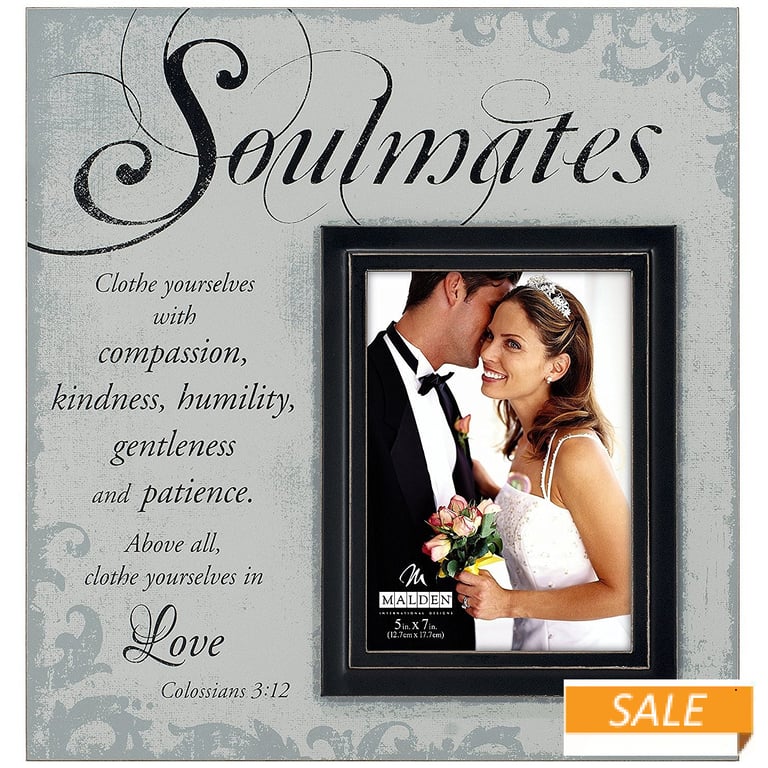 Product Details Malden Designs® SOULMATES SENTIMENTS 5x7 frame by Malden® — SOULMATES Clothe yourselves with compassion, kindness, humility gentleness and patience. Above all, clothe yourselves in LOVE Colossians 3:12 Beautifully constructed rustic style frame to display a 5"x7" photo. It has fanciful scroll in the corners of the frame. Glare resistant glass lens.Crafted by Malden Designs®, New England. SOULMATES SENTIMENTS 5x7 frame by Malden® Model #096287145473 List $32.00 You pay $9.90 In stock Can be shipped today [?] Your Price Match is Active Your request for a price of $0.00 for a minimum quantity of has been accepted. You have [time] left to purchase this item for $0.00 instead of $9.90 each. Find a Lower Price? We BEAT All Authorized Retailers [?] FEATURESDisplays:5"x7"Material:Wood (mdf/engineered)Finish:Silver, WhiteOccasion:Anniversary, Engagement, Romantic, WeddingStyle:Contemporary, Romantic, Words & whimsy, Sentiments | ready madeOrientation:Vertical OnlyBrand:Malden Designs®Display Type:Desktop or Wall Approx. Overall Dimensions:13"x13 1/2"x1" This item ships in its own box SHARE THIS ITEM Share on Facebook