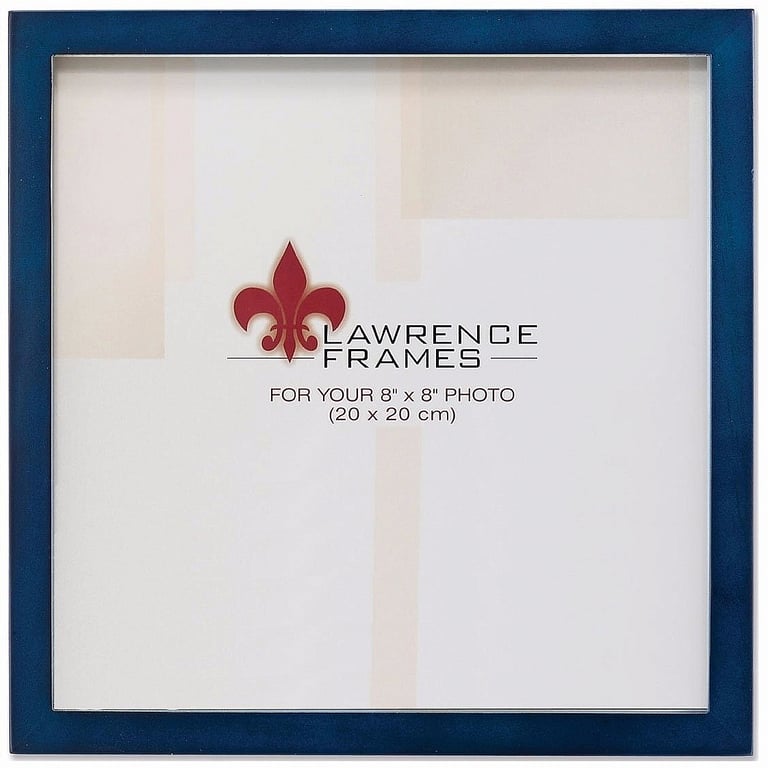 Main view Product Details Lawrence Frames® BLUE Square-Corner 8x8 frame by Lawrence® — Solid wood Marine-Blue stained frame is elegant and an easy style to decorate with.Constructed of matched varnished hardwoods with tailed corners and exact fitting back. Frame edge is a very contemporary ½" all-around.Easel backed for tabletop use; wall mounting hooks included. Glare resistant glass lens.By Lawrence Frames®, crafting fine frames for generations. BLUE Square-Corner 8x8 frame by Lawrence® Model #751148066020 List $23.00 You pay $16.95 This item IS in stock and can be expected to ship 01/19/2026 Your Price Match is Active Your request for a price of $0.00 for a minimum quantity of has been accepted. You have [time] left to purchase this item for $0.00 instead of $16.95 each. Find a Lower Price? We BEAT All Authorized Retailers [?] FEATURESDisplays:8"x8"Material:Wood (full grain)Finish:BlueOccasion:Business & office, Congratulations, Craft Projects, Home decorating, Teacher gifts, Team & coach gifts, Thank-Motivate-RewardStyle:Architectural, Classic, Contemporary, Minimal, TraditionalBrand:Lawrence Frames®Display Type:Desktop or Wall This item ships in its own box SHARE THIS ITEM Share on Facebook