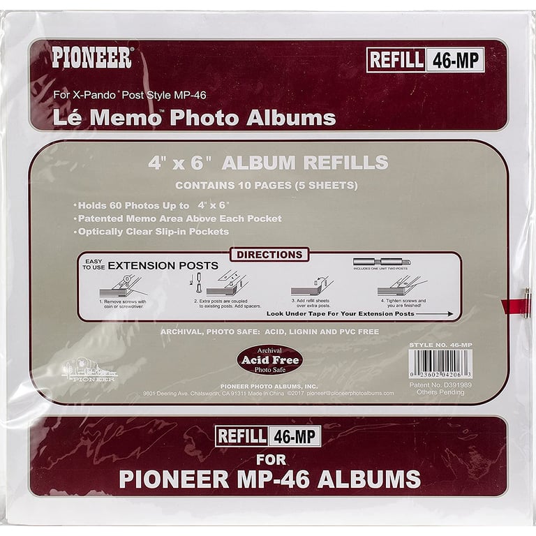 Main view Product Details Pioneer Albums® Genuine Pioneer® 12-at-a-time 4x6 white Refill Pack w/memo area — 12-at-a-time refills for your post-bound albums. Each package contains 5 sheets for an additional total of 60 photos - displayed back/front 6 clear pockets on each side (6-up); displays 12 photos at-a-time when open Holds prints up-to 4"x6" in each pocket. Features a shaded paper background area and a convenient memo writing area Overall page dimensions are 14"x14" Refills fit Pioneer model #MP46 albums - and many other popular brand '6-on-a-page' types Includes one set of extension posts Completely PVC and acid free. 100% photo and archival safe Produced and certified by Pioneer®, makers of albums for generations. Genuine Pioneer® 12-at-a-time 4x6 white Refill Pack w/memo area Model #023602042063 List $8.50 You pay $6.95 In stock Can be shipped today [?] Your Price Match is Active Your request for a price of $0.00 for a minimum quantity of has been accepted. You have [time] left to purchase this item for $0.00 instead of $6.95 each. Find a Lower Price? We BEAT All Authorized Retailers [?] FEATURESDisplays:4"x6"Material:Archival | Photo-SafeFinish:ClearOccasion:Business & office, Craft ProjectsStyle:TraditionalBrand:Pioneer Albums®Display Type:not applicable n/a Approx. Overall Dimensions:14"x14" SHARE THIS ITEM Share on Facebook