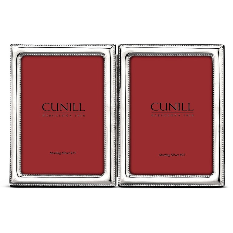 Main view Mfr authenticity mark Product Details Cunill® Silver VINARD BEADED Hinged Fine Sterling Silver 5x7 frame by Cunill® — This 'hard-to-find' folding hinged double frame is a natural wedding or newborn gift.Gorgeous fine .925 sterling, it will surely become a family heirloom. The Cunill quality is unsurpassed - even to the backing which is a fitted wood piece to easily lock-in your photo. Note the signature sterling lozenge latch - a hallmark of Cunill since 1916. Each piece is debossed on front with the family mark and .925 (sterling silver), proudly giving signature to the quality this 100+ year old company has earned.The border engraves beautifully. Click Personalize this item for more details.Cunill silver never needs polishing - it is finely lacquered to keep it tarnish free.Crafted in and imported from Italy. To view the complete collection, visit: Cunill® Italy VINARD BEADED Hinged Fine Sterling Silver 5x7 frame by Cunill® Cunill® WINTER Savings - ends Sunday: Buy More / Save More * Add this item to your cart for the full details of this promotion. Conditions may apply. Model #300844106624 List $470.00 You pay $442.95 In stock Ships next business day Your Price Match is Active Your request for a price of $0.00 for a minimum quantity of has been accepted. You have [time] left to purchase this item for $0.00 instead of $442.95 each. Find a Lower Price? We BEAT All Authorized Retailers [?] FEATURESDisplays:5"x7"Material:Sterling Silver (fine)Finish:SilverOccasion:Anniversary, Baby shower, Bar & Bat Mitzvah, Birthday, Business & office, Celebrating Travels, Congratulations, Corporate gifts, Employee honors, Engagement, Father`s Day, Friendship, Good luck, Graduation, Housewarming, Mother`s Day, Retirement, Romantic, Thank-Motivate-Reward, Valentine`s Day, WeddingStyle:Contemporary, Traditional, Sophisticated, Minimal, RomanticOrientation:Vertical OnlyBrand:Cunill® SilverDisplay Type:Desktop Only This item ships in its own box SHARE THIS ITEM Share on Facebook
