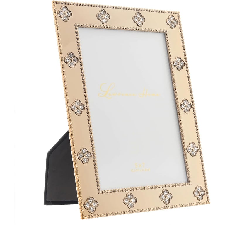 Main view Product Details Lawrence Frames® Sparkling clovers on gold 5x7 frame — Delicate clovers with European crystal clusters in gold, this frame is beautiful in any setting.It is a standout on a table or desk with a portrait of a sweetheart or couple.Very nice easel hardboard back for both landscape and portrait tabletop display.By Lawrence Frames®. Sparkling clovers on gold 5x7 frame Model #751148090575 List $49.00 You pay $40.95 This item IS in stock and can be expected to ship 01/20/2026 Your Price Match is Active Your request for a price of $0.00 for a minimum quantity of has been accepted. You have [time] left to purchase this item for $0.00 instead of $40.95 each. Find a Lower Price? We BEAT All Authorized Retailers [?] FEATURESDisplays:5"x7"Material:Gold plateFinish:GoldOccasion:Anniversary, Birthday, Congratulations, Good luck, Graduation, Mother`s Day, Romantic, Sweet 16, Valentine`s Day, WeddingStyle:Contemporary, Romantic, Teens & tweensOrientation:BothBrand:Lawrence Frames®Display Type:Desktop or Wall Approx. Overall Dimensions:6 1/2"x8 1/2"x3/4" This item ships in its own box SHARE THIS ITEM Share on Facebook