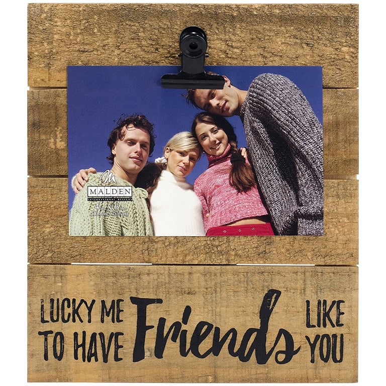 Main view Product Details Malden Designs® FRIENDS Life Expressions Clip frame by Malden® — LUCKY ME TO HAVE FRIENDS LIKE YOU Displays your favorite photos in a unique design. Clip lets you easily change photos or mementoes as you like. Barnwood natural plank finish. A great gift that will always be appreciated. This novelty frame is produced by Malden USA®. FRIENDS Life Expressions Clip frame by Malden® Model #096287150965 List $11.00 You pay $8.95 This item can be expected to ship by 01/26/2026. Order now by clicking ADD TO CART (below); you are only charged when we actually ship. Or, Click here to be automatically notified when it comes back in stock. Your Price Match is Active Your request for a price of $0.00 for a minimum quantity of has been accepted. You have [time] left to purchase this item for $0.00 instead of $8.95 each. Find a Lower Price? We BEAT All Authorized Retailers [?] FEATURESDisplays:4"x6"Material:Wood (mdf/engineered)Finish:Brown(Light)/Tan, NaturalOccasion:Bon voyage, Congratulations, Friendship, Get well, Home decorating, Inspirational, Weekend Host GiftsStyle:Contemporary, Distressed - Weathered, Words & whimsy, Sentiments | ready madeBrand:Malden Designs®Display Type:Desktop Only SHARE THIS ITEM Share on Facebook