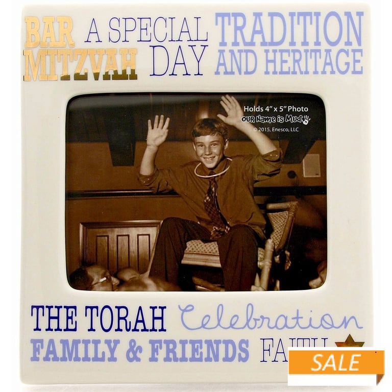 Main view Reverse Product Details Enesco BAR MITZVAH by Our Name is Mud® — BAR MITZVAH A SPECIAL DAY TRADITION AND HERITAGE THE TORAH - CELEBRATION FAMILY AND FRIENDS - FAITH L'Chaim! This colorful hand-painted frame is adorable for celebrating your guy's special day! Frame displays a 5"x4" photo behind its glare resistant lens (4¼" x 3¾" visible) Easel back for horizontal tabletop display only. Designed and crafted by Our Name is Mud®. BAR MITZVAH by Our Name is Mud® Model #045544880954 List $18.00 You pay $12.95 In stock Ships next business day [?] Your Price Match is Active Your request for a price of $0.00 for a minimum quantity of has been accepted. You have [time] left to purchase this item for $0.00 instead of $12.95 each. Find a Lower Price? We BEAT All Authorized Retailers [?] Approx. Overall Dimensions:6 5/8"x6"x3/8" SHARE THIS ITEM Share on Facebook
