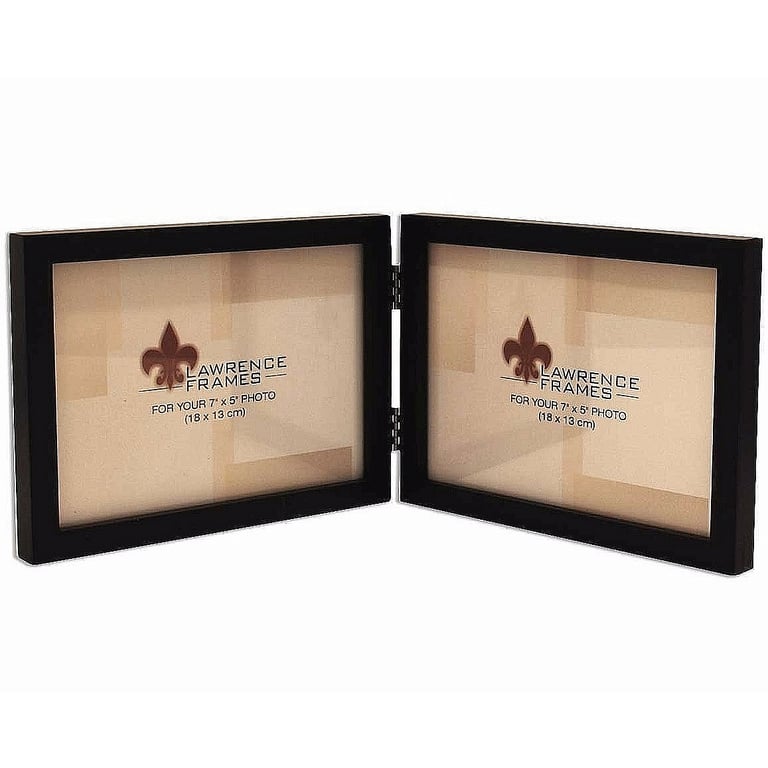 Main view Product Details Lawrence Frames® SQUARE CORNER classic <u>landscape</u> black hinged 5x7 double — A very nicely crafted hinged double, you will enjoy the look it gives to your photo story.Furniture finish black stain on select hardwoods - for two landscape prints.Beautiful moulding and back with tapered seams. Glare resistant glass lenses. Pewter hinges. Attractive black hardboard back. Hooks included for vertical or horizontal wall display. Frame edge is a very contemporary ½" all-around.By Lawrence®. Click the Lawrence Frame collection to shop the entire line. SQUARE CORNER classic landscape black hinged 5x7 double Model #751148055581 List $30.00 You pay $20.95 In stock Ships next business day [?] Your Price Match is Active Your request for a price of $0.00 for a minimum quantity of has been accepted. You have [time] left to purchase this item for $0.00 instead of $20.95 each. Find a Lower Price? We BEAT All Authorized Retailers [?] FEATURESDisplays:5"x7"Material:Wood (full grain)Finish:BlackOccasion:Birthday, Business & office, Celebrating Travels, Corporate giftsStyle:Classic, Architectural, MinimalOrientation:Horizontal OnlyBrand:Lawrence Frames®Display Type:Desktop or Wall This item ships in its own box SHARE THIS ITEM Share on Facebook