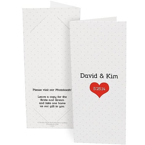 Back to results Scroll Items 7861 of 11254 Product Details Collectors Gallery MODERN HEART Personalized Photo Strip holders for 2x6 Photobooth Prints — Photo booths are popular at weddings, sweet 16 parties, quinceaneras, bar/bat mitzvahs, graduations, anniversaries, family reunions, holiday parties, festivals, and corporate events. Give guests something to take their photo strips home in with a personalized folder. Choose from any of our customizable designs, or create a folder unique for your event. All designs are printed on smooth, lightweight 12 pt. paper stock and hold a classic 2" x 6" picture strip. Whether it's a party favor or a marketing piece for your company, photo booth folders make great event souvenirs. An inexpensive party favor Overall size measures 3" x 7" (when closed) Holds a 2" x 6" photo (for photobooth strips) Lightweight smooth finish paper Inside corner die-cuts hold picture in place Shipped flat, not folded FREE personalization included in the price Envelopes are not available Sold in increments of 10; minimum 100 folders. MODERN HEART Personalized Photo Strip holders for 2x6 Photobooth Prints Model #021352012213 $9.90 ( set of 10 / $0.99 ea ) This item can be expected to ship by 12/05/2025. Order now by clicking ADD TO CART (below); you are only charged when we actually ship. Or, Click here to be automatically notified when it comes back in stock. Your Price Match is Active Your request for a price of $0.00 for a minimum quantity of has been accepted. You have [time] left to purchase this item for $0.00 instead of $0.99 each. Find a Lower Price? We BEAT All Authorized Retailers [?] Approx. Overall Dimensions:3"x7" SHARE THIS ITEM Share on Facebook
