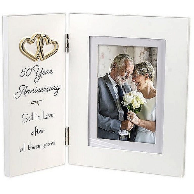 Product Details Malden Designs® 50th Anniversary matted 5x7/4x6 Hinged Keepsake frame — 50th Year Anniversary Still in Love after all these years Nice hardboard backing. Glare resistant glass lens. Matted so you can display either a 4"x6" or 5"x7" print. Crafted by Malden Design®. 50th Anniversary matted 5x7/4x6 Hinged Keepsake frame Model #096287169851 List $19.50 You pay $15.95 In stock Can be shipped today [?] Your Price Match is Active Your request for a price of $0.00 for a minimum quantity of has been accepted. You have [time] left to purchase this item for $0.00 instead of $15.95 each. Find a Lower Price? We BEAT All Authorized Retailers [?] FEATURESDisplays:4"x6"Material:Wood (mdf/engineered)Finish:Gold, WhiteOccasion:AnniversaryStyle:Classic, Contemporary, Romantic, Words & whimsy, Sentiments | ready madeOrientation:Vertical OnlyBrand:Malden Designs®Display Type:Desktop Only This item ships in its own box SHARE THIS ITEM Share on Facebook