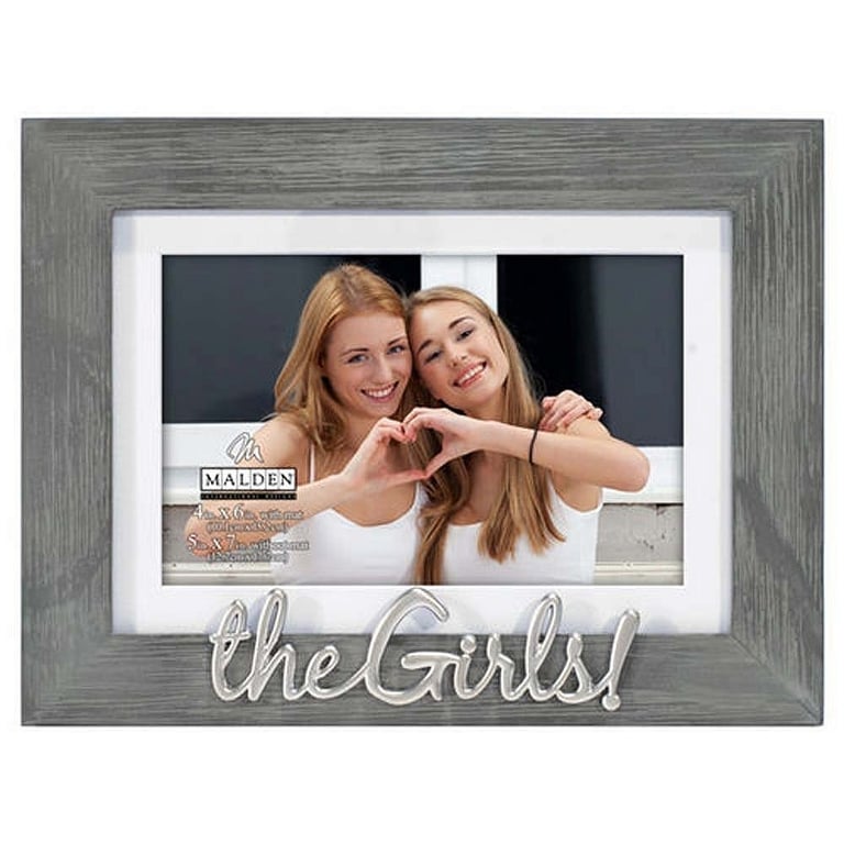 Main view Product Details Malden Designs® THE GIRLS! 5x7/4x6 Matted Frame Captures a special moment together — Celebrate THE GIRLS with this special frame created just for them!Add a special snapshot and you've made a great gift that will always be appreciated.The text is satin silver mounted onto the distressed charcoal moulding. White mat enhances your 4x6 print.Glare resistant glass lens. Hardboard easel back for tabletop display. Wall hooks included for easy hanging.This novelty frame is produced by Malden USA®. THE GIRLS! 5x7/4x6 Matted Frame Captures a special moment together Malden Designs® FALL CELEBRATION Savings - ends SundayBuy More / Save More * Add this item to your cart for the full details of this promotion. Conditions may apply. Model #096287148627 List $19.00 You pay $13.95 In stock Can be shipped today [?] Your Price Match is Active Your request for a price of $0.00 for a minimum quantity of has been accepted. You have [time] left to purchase this item for $0.00 instead of $13.95 each. Find a Lower Price? We BEAT All Authorized Retailers [?] Approx. Overall Dimensions:9 1/8"x7"x1" This item ships in its own box SHARE THIS ITEM Share on Facebook