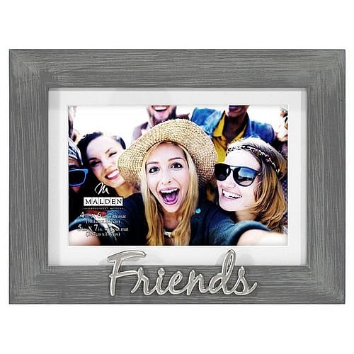 Main view Product Details Malden Designs® FRIENDS 5x7/4x6 Matted Frame Captures a special moment together — Celebrate FRIENDS with this special frame created just for them!Add a special snapshot and you've made a great gift that will always be appreciated.The text is satin silver mounted onto the distressed charcoal moulding. White mat enhances your 4x6 print.Glare resistant glass lens. Hardboard easel back for tabletop display. Wall hooks included for easy hanging.This novelty frame is produced by Malden USA®. FRIENDS 5x7/4x6 Matted Frame Captures a special moment together Model #096287148603 List $19.00 You pay $13.95 In stock Ships next business day [?] Your Price Match is Active Your request for a price of $0.00 for a minimum quantity of has been accepted. You have [time] left to purchase this item for $0.00 instead of $13.95 each. Find a Lower Price? We BEAT All Authorized Retailers [?] FEATURESDisplays:4"x6"Material:Wood (mdf/engineered)Finish:Gray/Charcoal, SilverOccasion:Birthday, Friendship, Weekend Host GiftsStyle:Contemporary, Teens & tweens, Words & whimsy, Sentiments | ready madeOrientation:Horizontal OnlyBrand:Malden Designs®Display Type:Desktop or Wall Approx. Overall Dimensions:9 1/8"x7"x1" This item ships in its own box SHARE THIS ITEM Share on Facebook